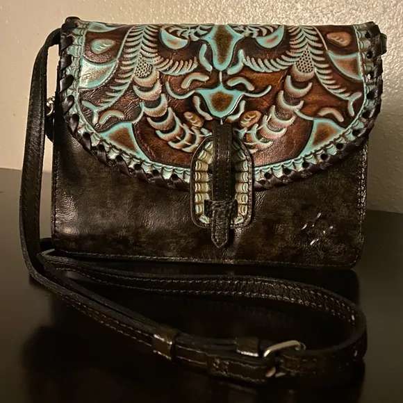 Gorgeousous rich dark brown and turquoise hand tooled leather bag | purse. Offering two inner compartments, with one center zip divider, 6 card slits, one inner side zip and two inner open pockets. One exterior zip pocket on back. Measures 9” by 6” with a 3” base. Strap drop 25” max but is adjustable and can be shortened.