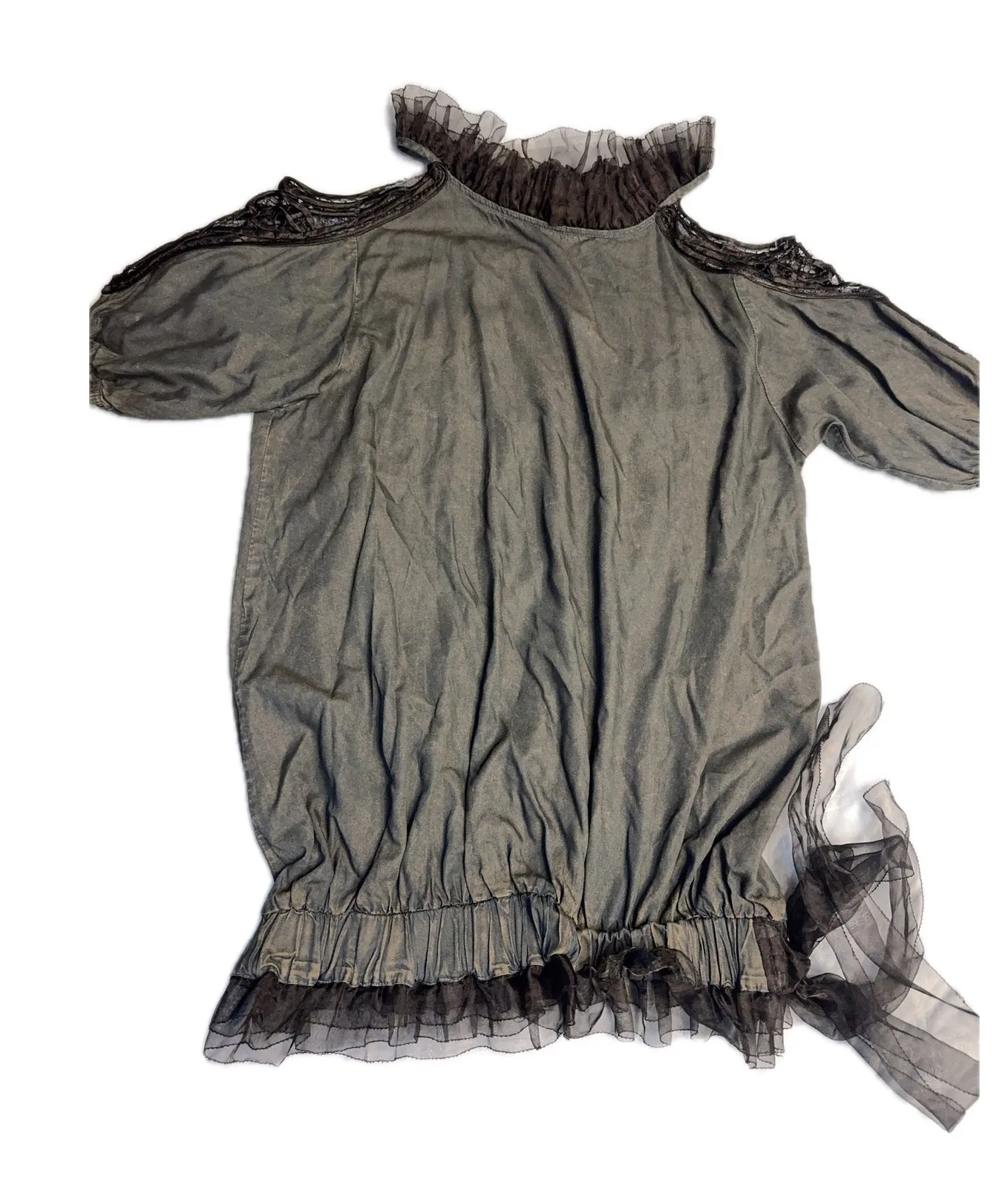 Keer Qiaowa Cold Shoulder Tulle Trim Blouse – Size L Softly edgy and romantic, this washed gray blou... Show more