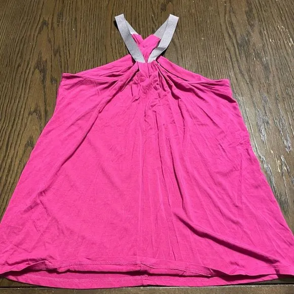 Apres Ramy Brook Magenta Gray Lisa Cross Front Tank Top, Medium Beautiful! Perfect condition. Im obsessed with this magenta pink color. This does not have a size tag on it but it looks like a medium to me. Smoke and pet free home. No flaws at all, like new. Very stretchy and nice feeling. 5% Spandex, 95% Viscose. There is a snap button near the neckline so you can wear it like the model is wearing it in the stock photo. The straps are a gray color. Please note that this top color may slightly vary due to photographic lighting sources or your monitor settings. Its a really pretty shade of magenta pink though. Size medium.