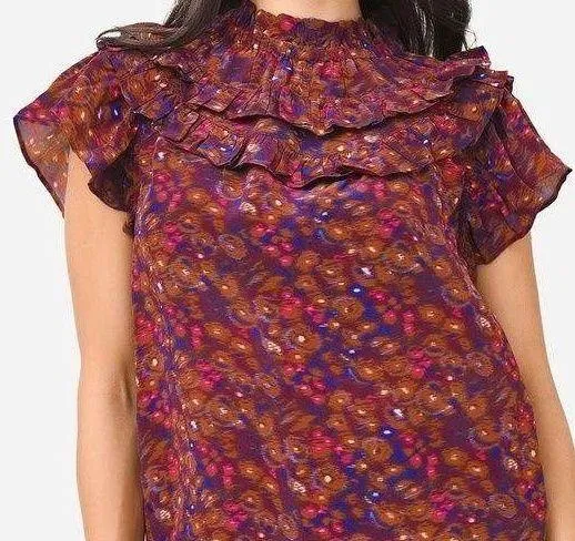 Description Printed top with short flutter sleeves and a ruffled yoke. Features Top High Ruffle Neck... Show more