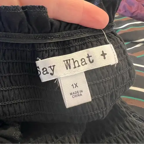 Great condition. Say what? Smocked off shoulder top. Short sleeve. Black. Plus size 1X. 65% cotton, 35% polyester. Pit to pit laying flat 19” Shoulder to hem 17” Sleeve (pit to hem) 2.5”. All measurements are approximate and taken laying flat. Smoke free home. No trades, offers welcome.