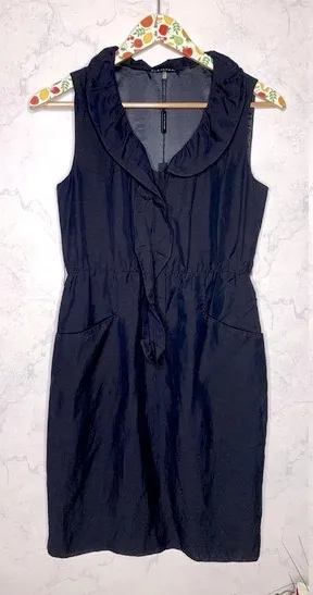 Elie Tahari Navy Blue linen ruffle collar sheath dress size 2 NWT new with tags Linen dress with ruffle collar detailing at neckline and hidden button placket. Oversized pockets. Belt loops. Sleeveless. Fully lined. Approx. Measurements: 17.5” pit to pit 14” waist 19” hips 39” length Original belt not included, I paired it with a calf hair leopard print skinny belt for styling Offers welcome! Tags: wedding guest event office career chic sophisticated luxe modest date night designer wedding guest