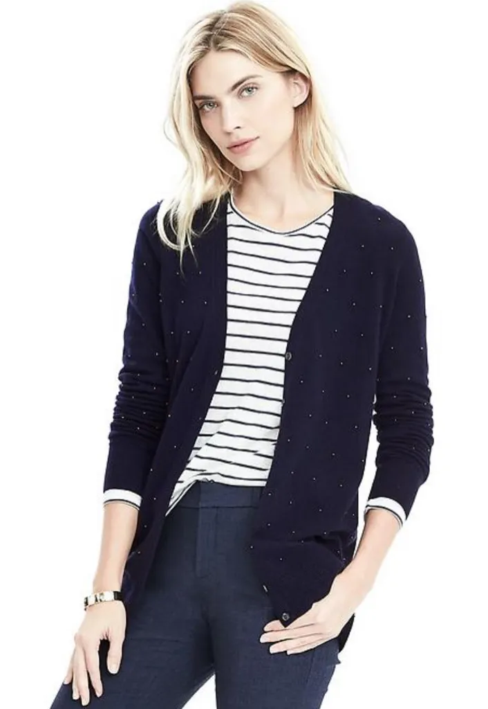 This beautiful navy cardigan sweater is so soft and comfortable made with Italian merino wool and ca... Show more