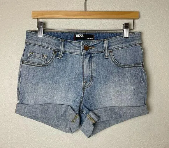 Stylish light blue denim shorts. Features rolled cuffs and classic five-pocket design. Perfect for c... Show more