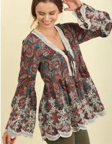 Umgee Paisley Boho Printed Wide Sleeve Blouse v neck lace up detail crochet trim great shape