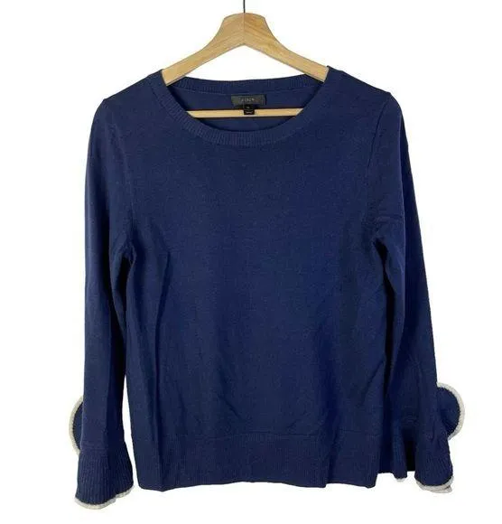 J. Crew Navy Blue Crewneck Merino Wool Ruffle Sleeve Sweater Good used condition, minimal signs of... Show more