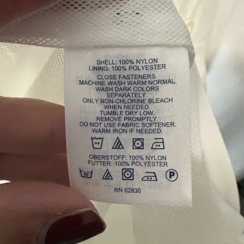 This Lands' End Women's White Rain Jacket in size 1X is perfect for outdoor activities in the summer, fall, and spring. Made of 100% nylon with a polyester lining, this short-length jacket features long sleeves and a button and zipper closure. It is both stylish and functional, suitable for travel and casual occasions. Easy to care for with machine washable instructions, this classic rain coat from Lands' End is a versatile addition to any woman's wardrobe. Measurements (approximate, from flat lay): Pit 25.5" Waist 25" Hip 29" Length 30" Sleeve length 25.5" Condition notes: *Faint marks on front right pocket - see last pic *missing detachable hood