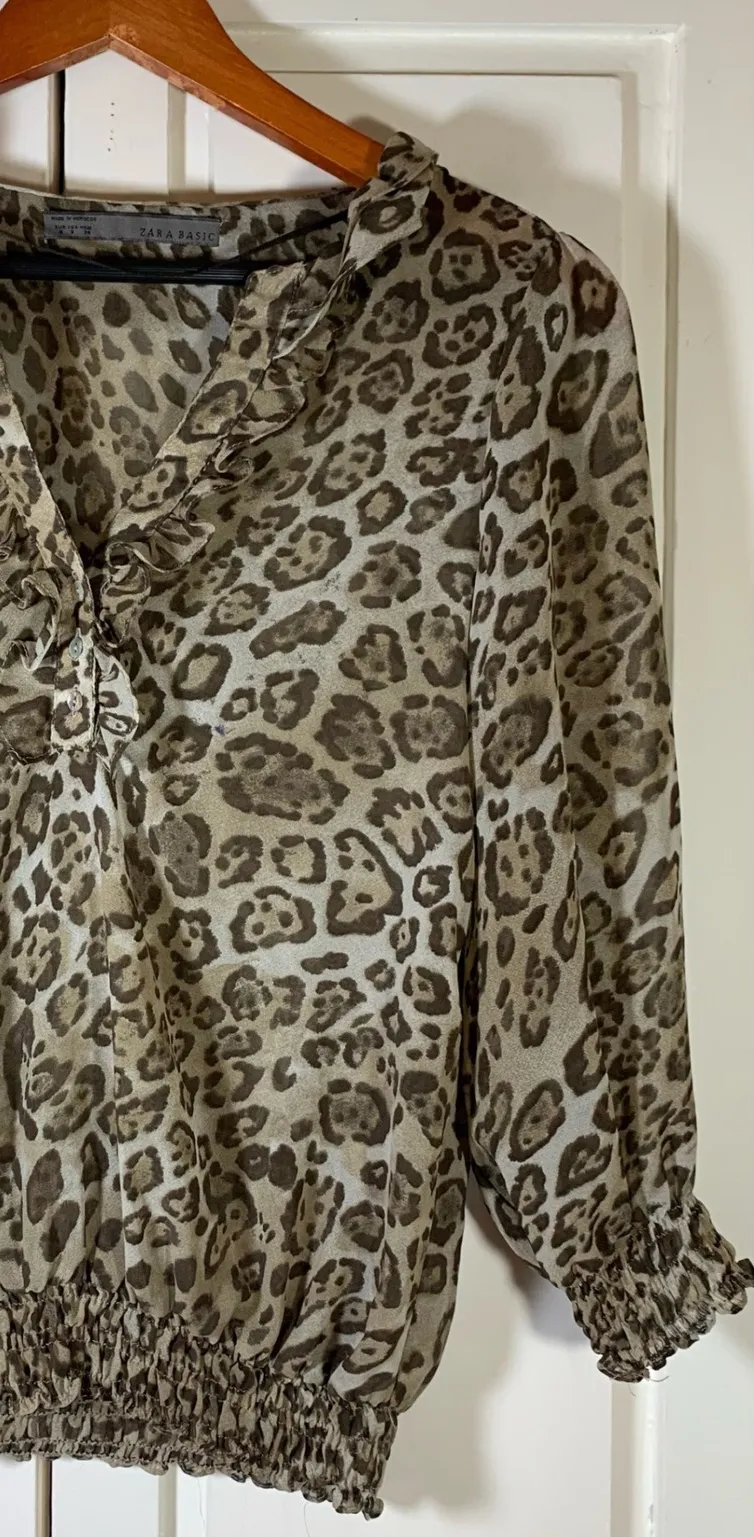 A chic and stylish Zara Basic blouse featuring a trendy leopard print. This top boasts a flattering V-neckline adorned with delicate ruffle trim, adding a touch of femininity. The 3/4 sleeves are finished with elasticated cuffs, creating a subtle blouson effect. An elasticated hemline cinches the waist for a comfortable and flattering fit. Perfect for a casual brunch with friends or a stylish evening out, this blouse can be dressed up or down for any occasion. Materials tag missing. Zara Basic, Leopard Print Blouse, Ruffle Trim, 3/4 Sleeve, Sheer Top, Animal Print, Bohemian, Casual Blouse, Womens Top, Size Small, Elastic Hem, V-Neck Blouse, Brown Beige, Boho Chic Top