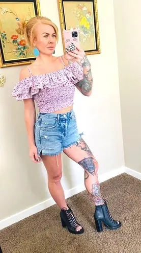 Revolve NICHOLAS size 4 ruffled smocked off the shoulder top. Sold out on revolve New-like condi... Show more