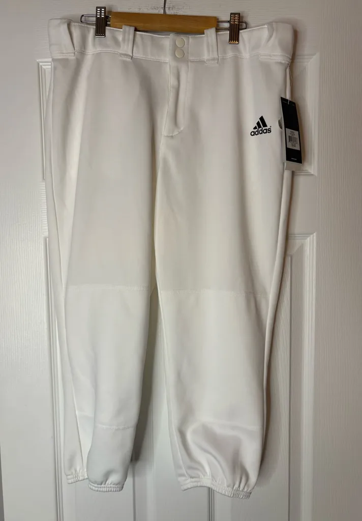 Classic white pants with iconic Adidas logo. Ideal for active wear. Softball ready!