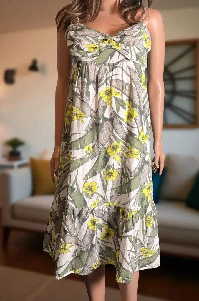 Banana Republic Midi Dress size 8 Linen Blend -Empire - Ruffle. Off white w/ green & gray floral/tro... Show more