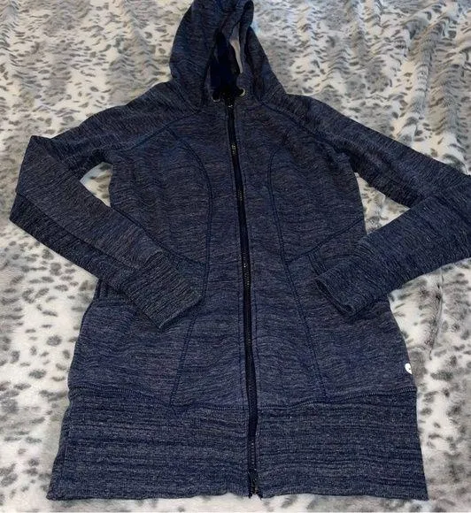 Heathered Navy Hoodie Full zipper closure Longer in length Thumb holes on cuffs Small zipper poc... Show more