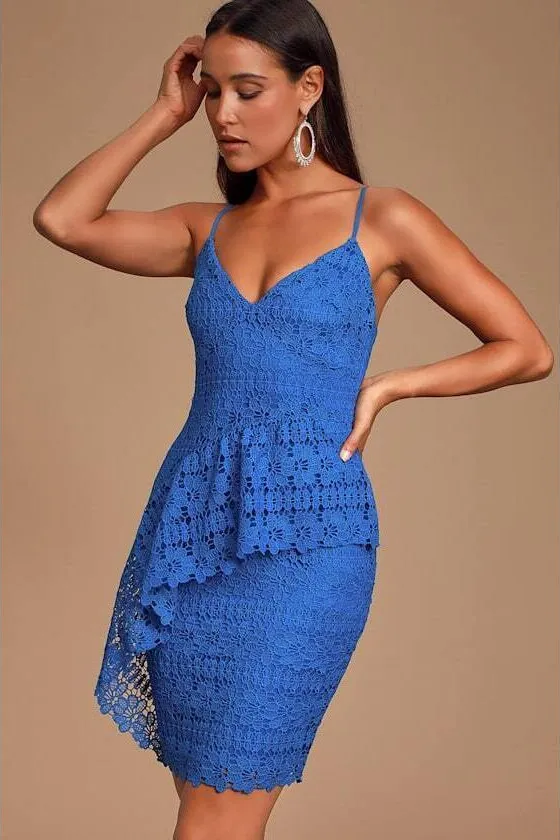 Lulus Exclusive! It's time to party in the Lulus McKenzie Royal Blue Lace Ruffled Dress! Gorgeous floral crocheted lace, atop a knit liner, shapes a darted bodice with V-neckline and adjustable spaghetti straps. More crocheted lace decorates the bodycon s