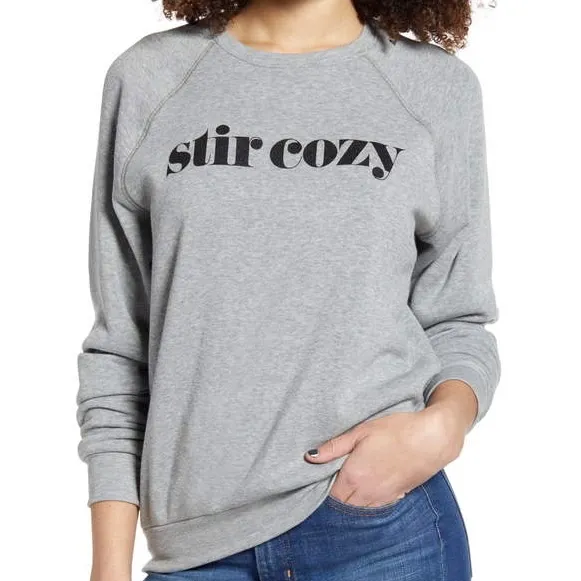 BP. Stir Cozy Graphic Sweatshirt. Your snow-day uniform is ready, cut with raglan sleeves in a comfy blend and made to coordinate with every couch when you report for binge-watching duty. Pullover. Crew neckline. Long sleeves. Soft fleece fabric. Main body material: 50% polyester 50% rayon. Rib material: 48% polyester 48% rayon 4% spandex. Heather grey color with black words printed on the front.
