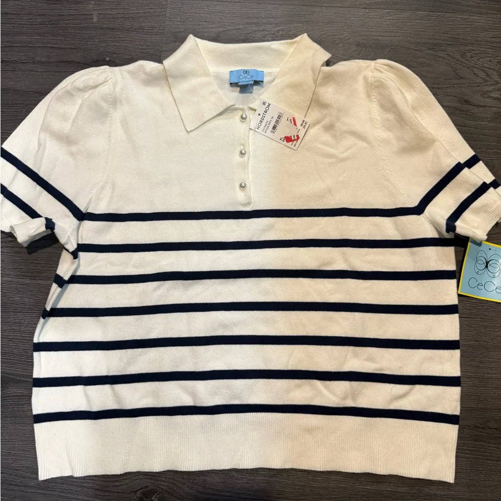 Classic polo sweater with pearl buttons. Soft lightweight sweater fabric with stripes and collars b... Show more
