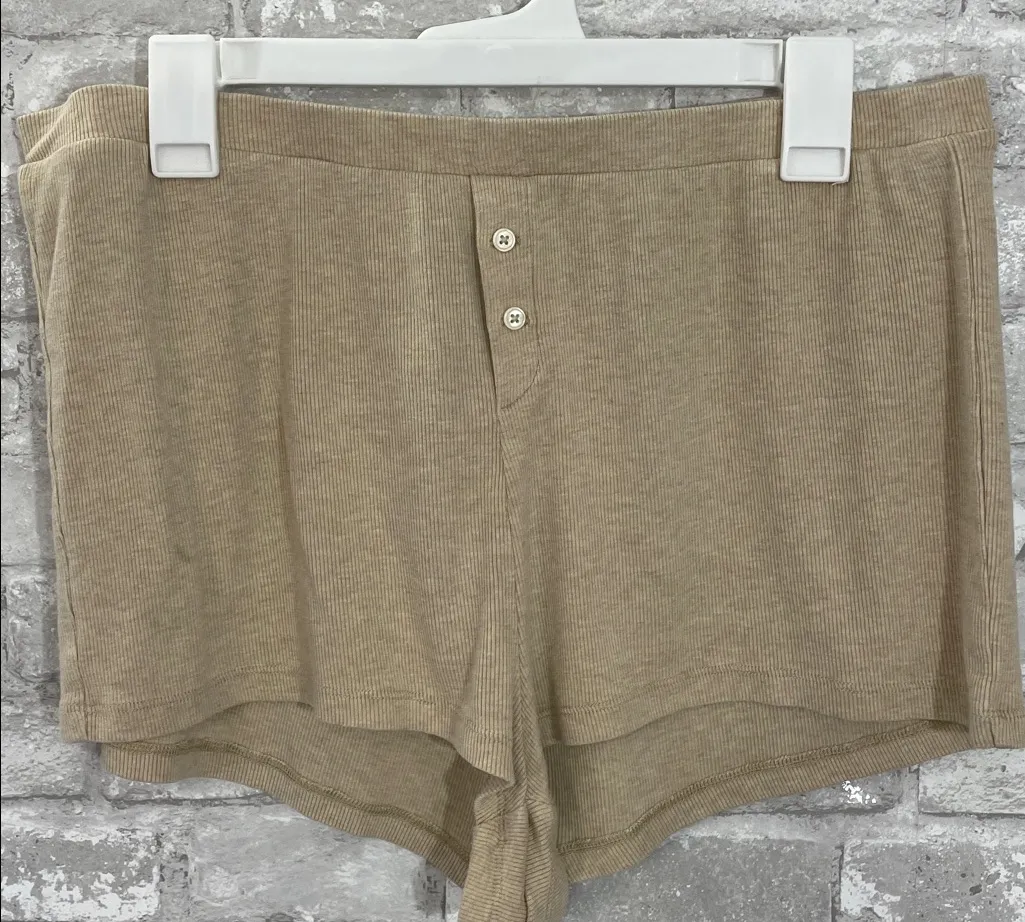 Stylish beige ribbed shorts. Perfect for lounging. Style BA010 Lounge shorts with button details