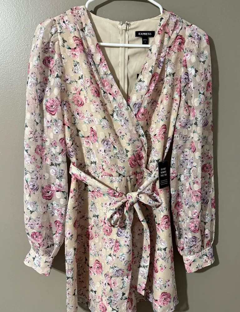 Chic floral wrap jumpsuit. Features a tie waist. Long sleeves with a soft floral pattern.