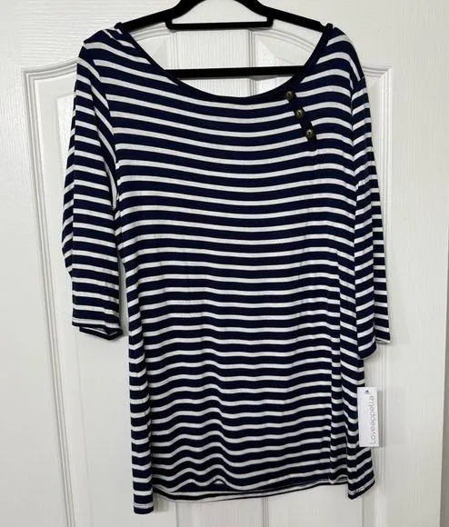Chic navy and white stripes. Comfortable long sleeves. Stylish button accents on shoulder. NWT Look stylish and comfortable with this Loveappella White and Navy Blue and White Striped Top. The top features straight sleeves, a boat neck, and decorative buttons at the shoulders. It is made of a lightweight and stretchy material, a blend of spandex and rayon, and has a jersey fabric type. The top is perfect for travel and casual occasions. It is a size XL and has a nautical look.