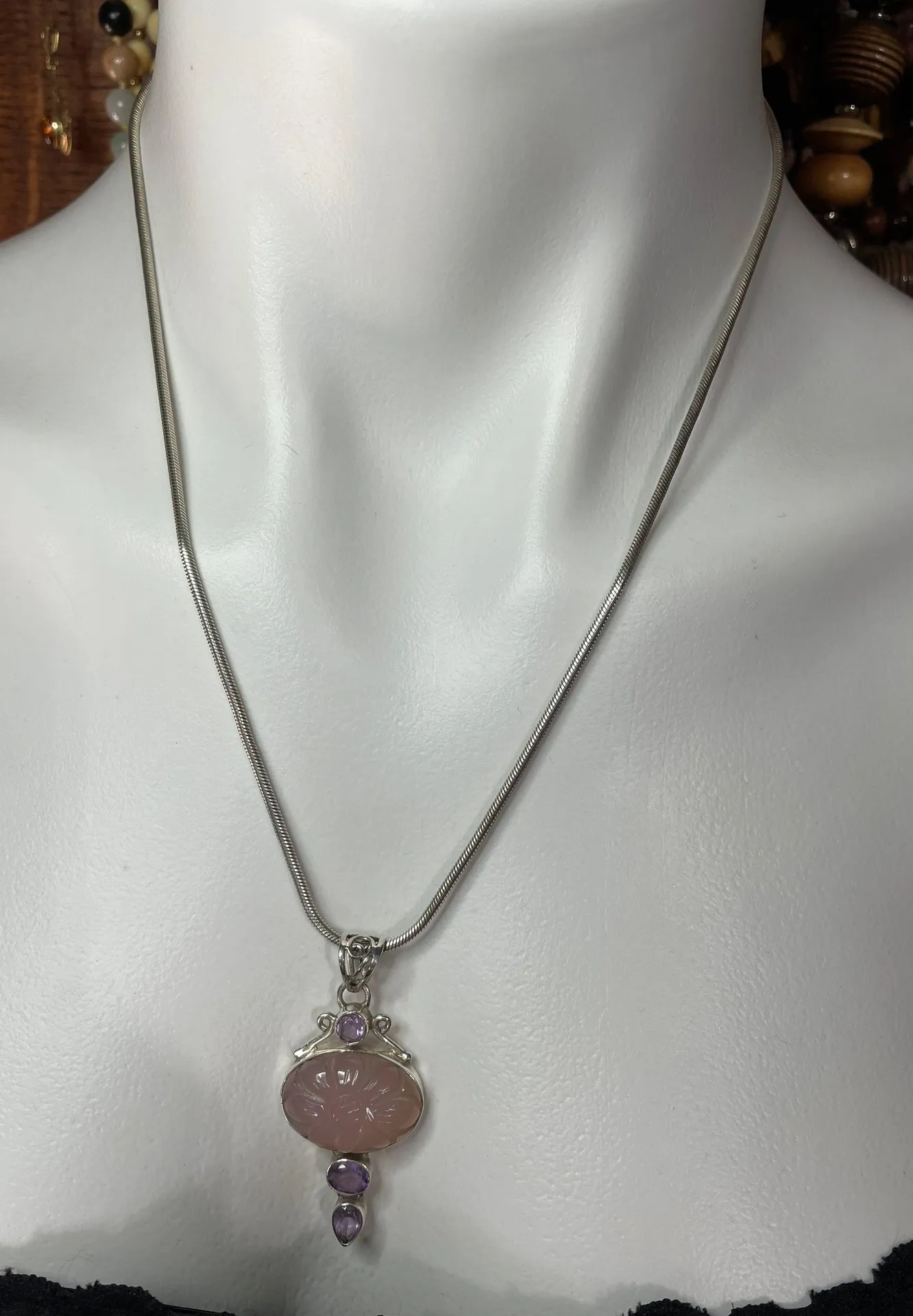 You are looking at a beautiful vintage 925 sterling silver carved flower on oval Cabochon pink Quartz & amethyst pendant & snake chain necklace. Both jewelry pieces are stamped 925 & tested real 925 sterling silver. All stones are securely bezeled. The oval clasp is in excellent working condition. In great condition. 20.25” Long x 1.85mm wide & thick Pendant: 2.10” drop from top of bail to the lowest point x 1” wide (widest point) x 8.44mm thick (thickest point) Quartz: 22.48mm W x 15.85mm H Round Amethyst: 4.82mm Oval Amethyst: 7.14mm H x 5.19mm Teardrop Amethyst: 6.71mm H x 4.93mm W Please inspect each pic for those are important part of item description. Thank you for stopping by.