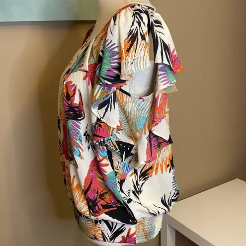Size medium, pleats in the front, ruffle sleeves, tropical Hawaiian coastal print, cap to short slee... Show more