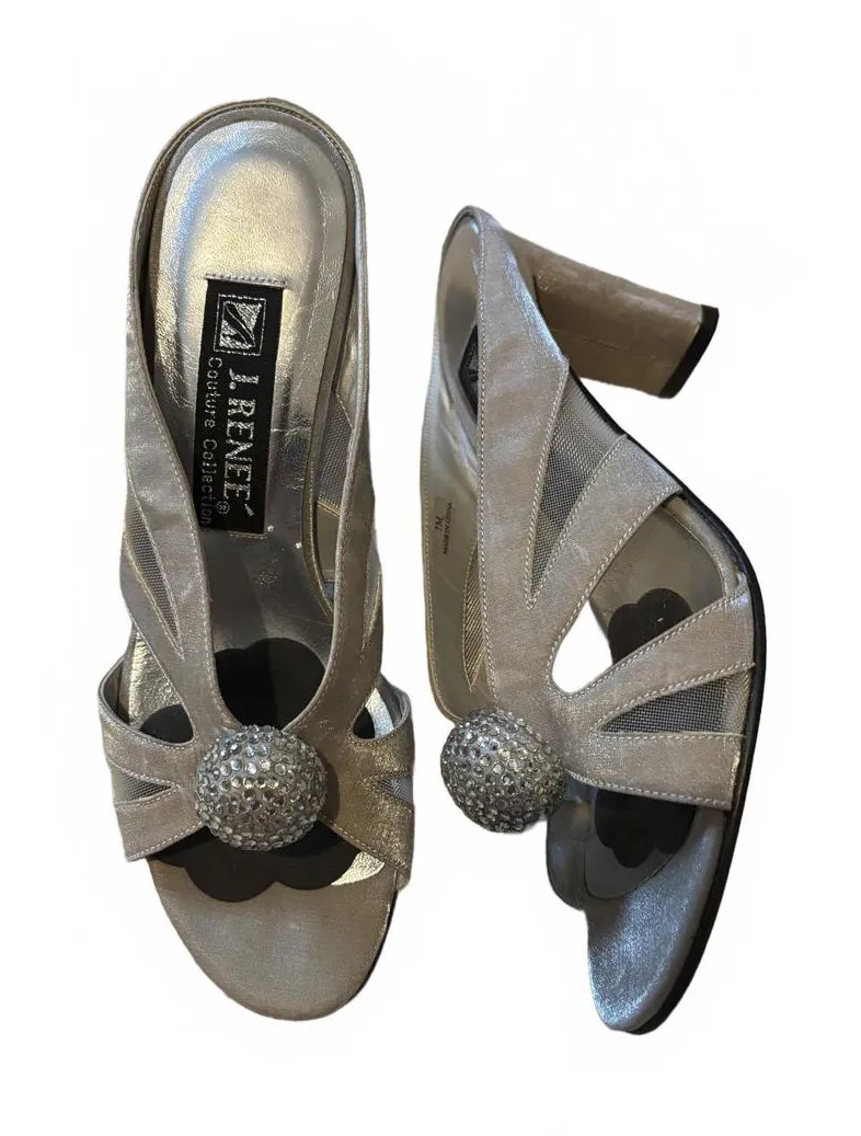 Elegant women's heeled sandals in silver from Reneé Couture Collection. Features a stylish cut-out design with a decorative spherical accent on the front. Open-toe style with a comfortable block heel. Perfect for formal occasions or dressy events. Size 7