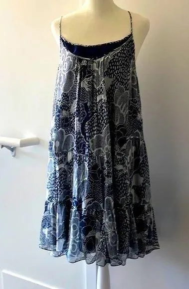 Elegant dress with intricate navy patterns. Crafted by Diane Von Furstenberg. 100% Silk Excellent Co... Show more