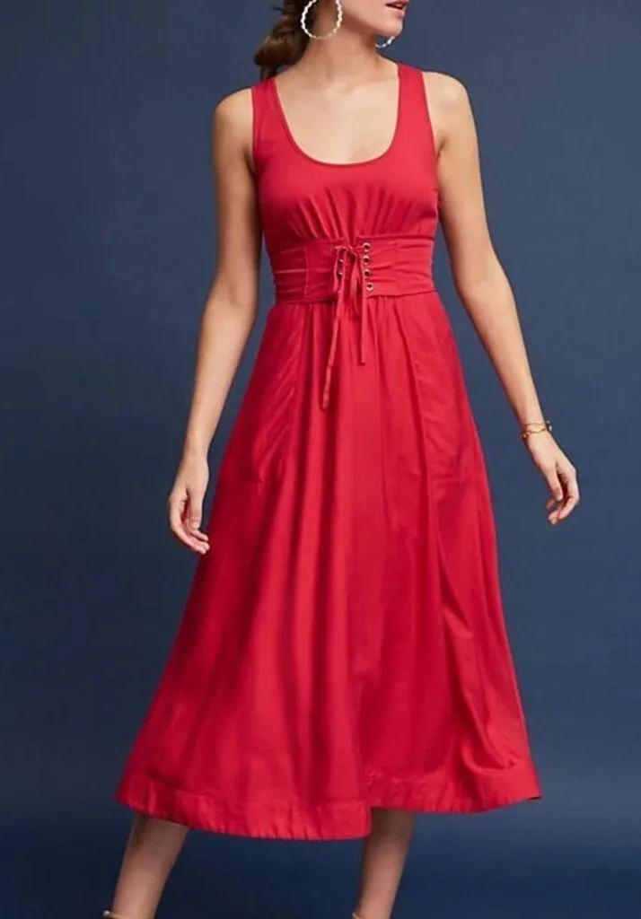 Step into effortless sophistication with this Tracy Reese for Anthropologie midi dress. Crafted in a bold lipstick red, this piece features a flattering scoop neckline, adjustable corset-style waist tie, and a breezy A-line silhouette that moves beautifully with you. The fitted bodice highlights your shape, while the flowy skirt makes it perfect for everything from summer parties to date nights.