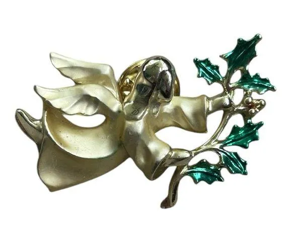 Louis GIUSTI vintage gold tone, brushed pin or brooch. One and a half inches wide by 1 inch. Christmas angel holiday Faith nativity greens garland herald marked on the back with clasp/hardware.