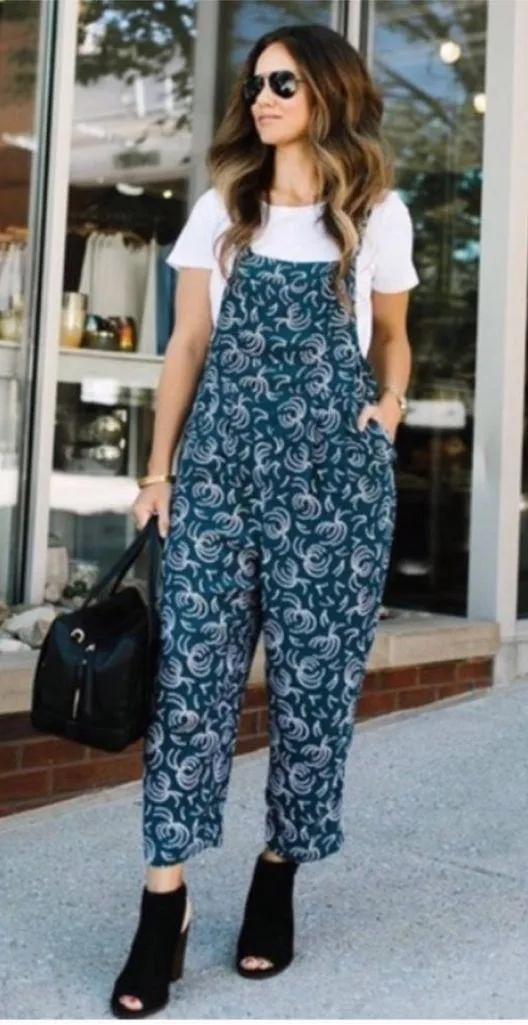 Chic Maeve jumpsuit with teal and white swirl design. Ideal for casual wear. Waist 17” Inseam 22”... Show more
