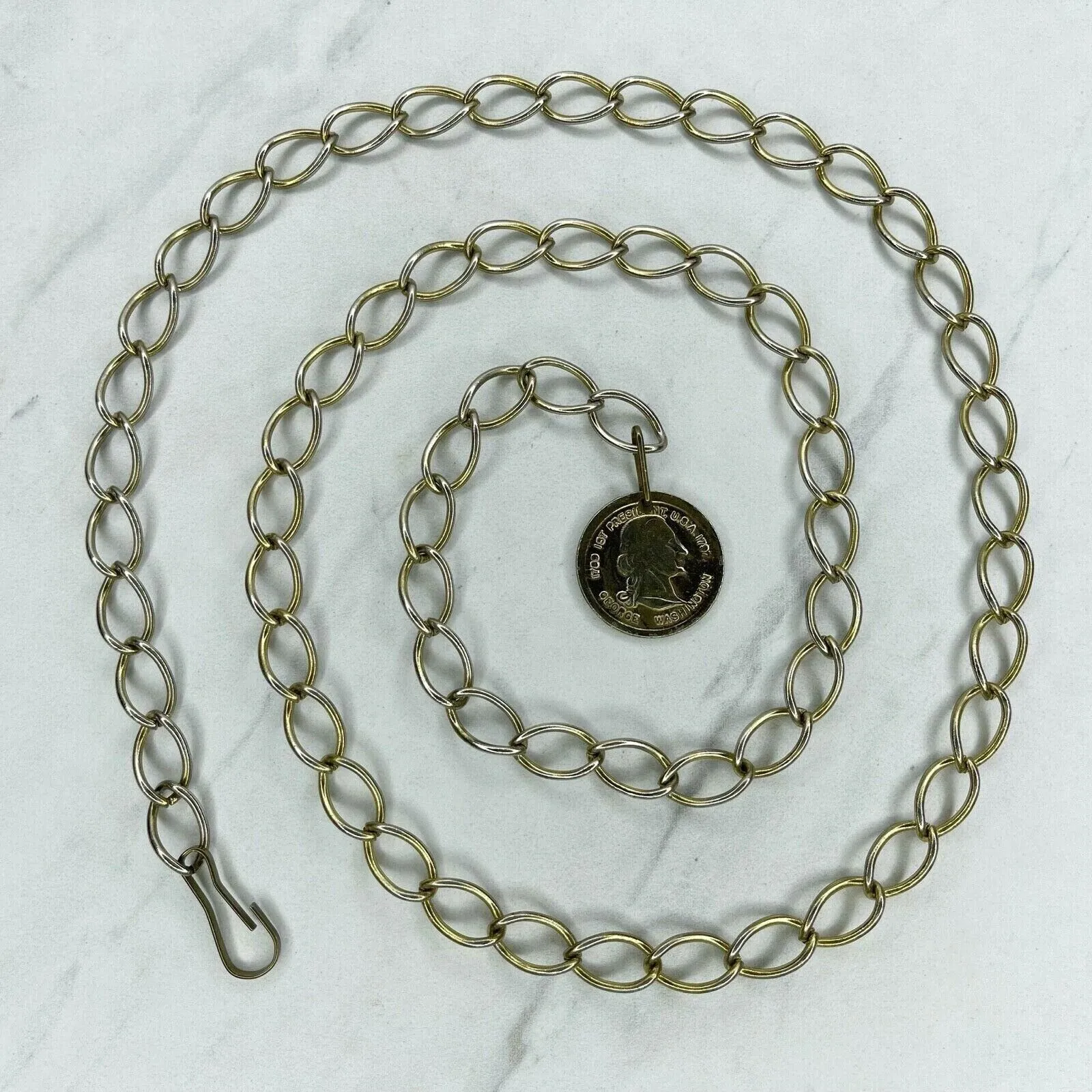 📏 Size: Small (S) 🤍 Color: Gold tone 👗 Style: Chain Link Trendy chain featuring a George Washington coin charm! This versatile piece can be worn as jewelry or layered over clothing for an edgy look. The adjustable gold-tone chain design offers multiple styling options. Details: - Maximum adjustable length: 35 inches - Width at widest point: 0.5 inches - Weight: 2.4 oz - Gold-tone finish - George Washington coin charm - Hook closure for easy wear Condition: Preowned with hardware finish wear and scuffs Perfect for festival looks, layering over dresses, or wearing with crop tops! This piece adds instant edge and personality to any outfit. A1235-2.4