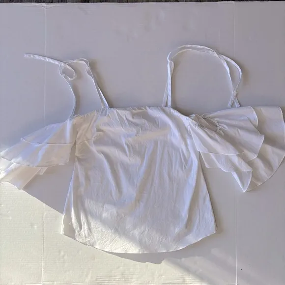 White House black Market Size 4 Solid bright white Indie cold shoulder blouse poplin Tiered ruffl... Show more