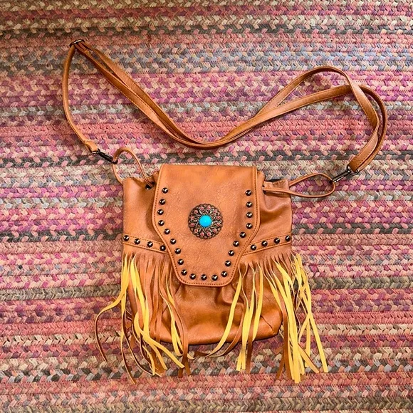 New without tags. Faux turquoise, fringe & studded details. Strap is adjustable to wear as a shoulde... Show more