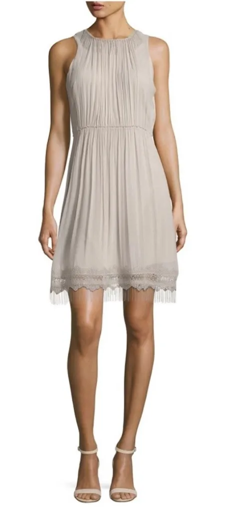Elegant taupe mini dress with delicate lace hem. Perfect for stylish outings. NOTE : With Flaw please see last photos Elie Tahari Demetria Metal / Lace Trim Dress 100% Silk Chiffon Retail $498 Delicate silver-tone metal / beaded / chain fringe at neckline and hem Hem has vintage-look lace High jewel neckline Sleeveless Short / Above the Knee / Mini Fully lined / Poly Waist has very light stretch for comfort Bra keeper snaps on shoulders Taupe / Beige / Solid Hidden back zip