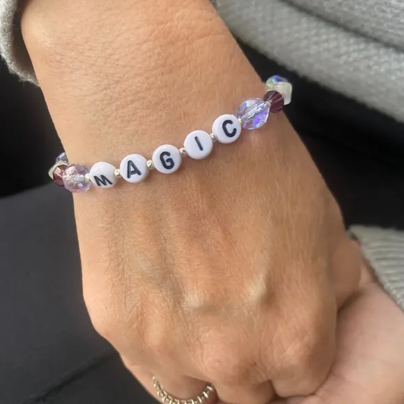6.5 inches Round plastic letter bracelets Purple bicone beads Lavender Round Faceted AB beads Clear frosted square beads Springring & jumpring clasp closure Handmade Unique, inspirational, one-of-a-kind, custom, gift, trendy, goals, sparkles NOT STRETCHY Great new Condition