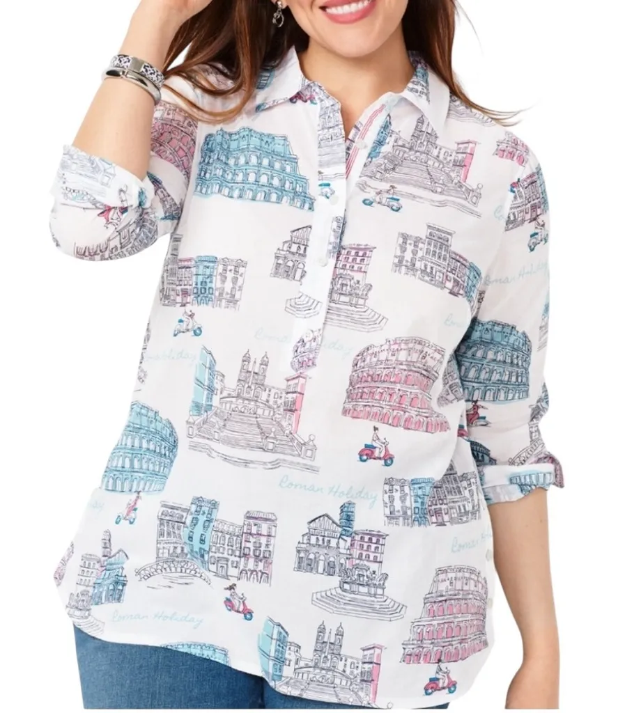 Style Details • Popover tunic top • Collard v-neck • Quarter button front • Long button sleeves •... Show more