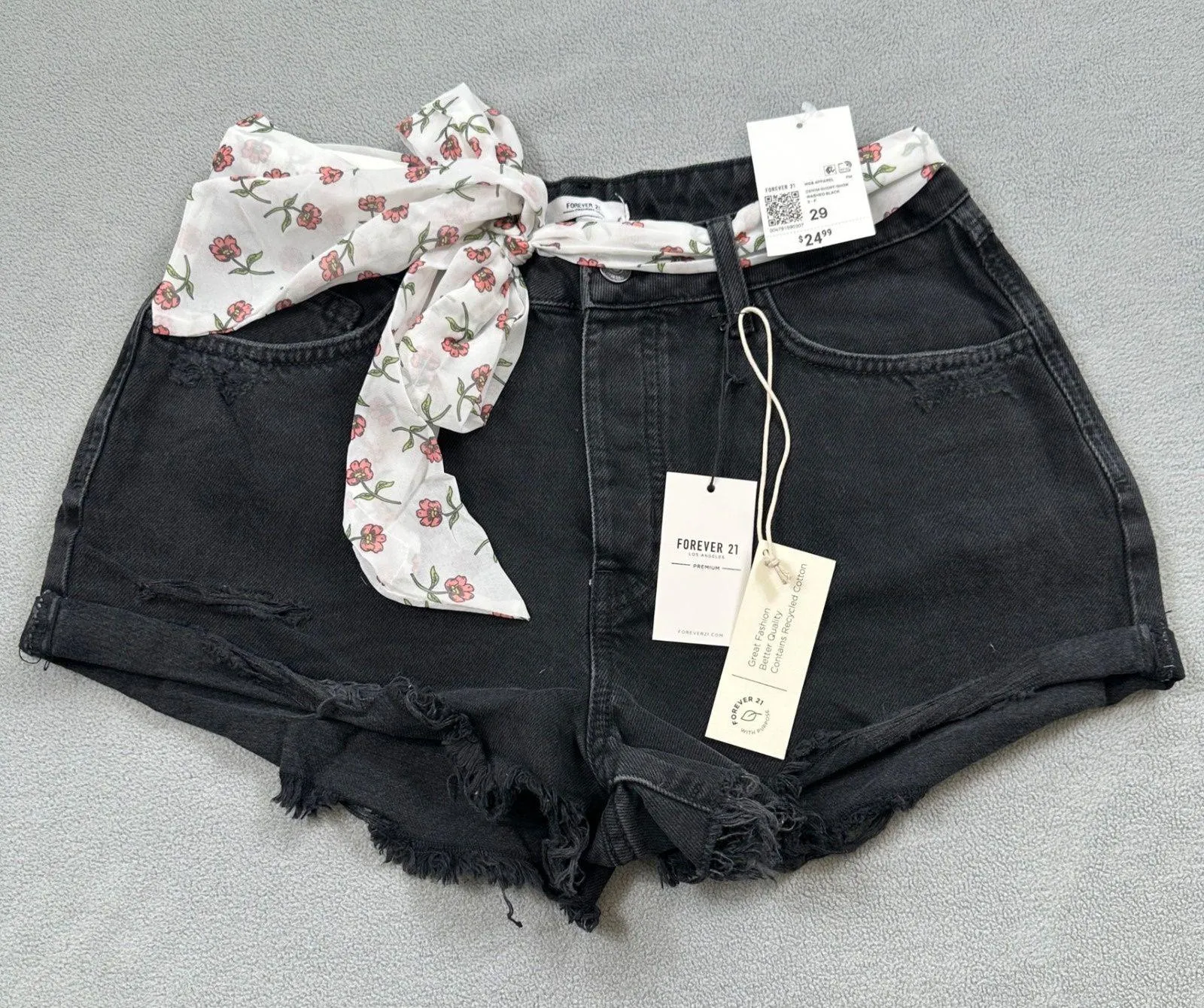 Keywords: black denim shorts, womens shorts, high waisted shorts, frayed hem shorts, forever 21, denim shorts, size 29, casual shorts, summer shorts, scarf belt, washed black
