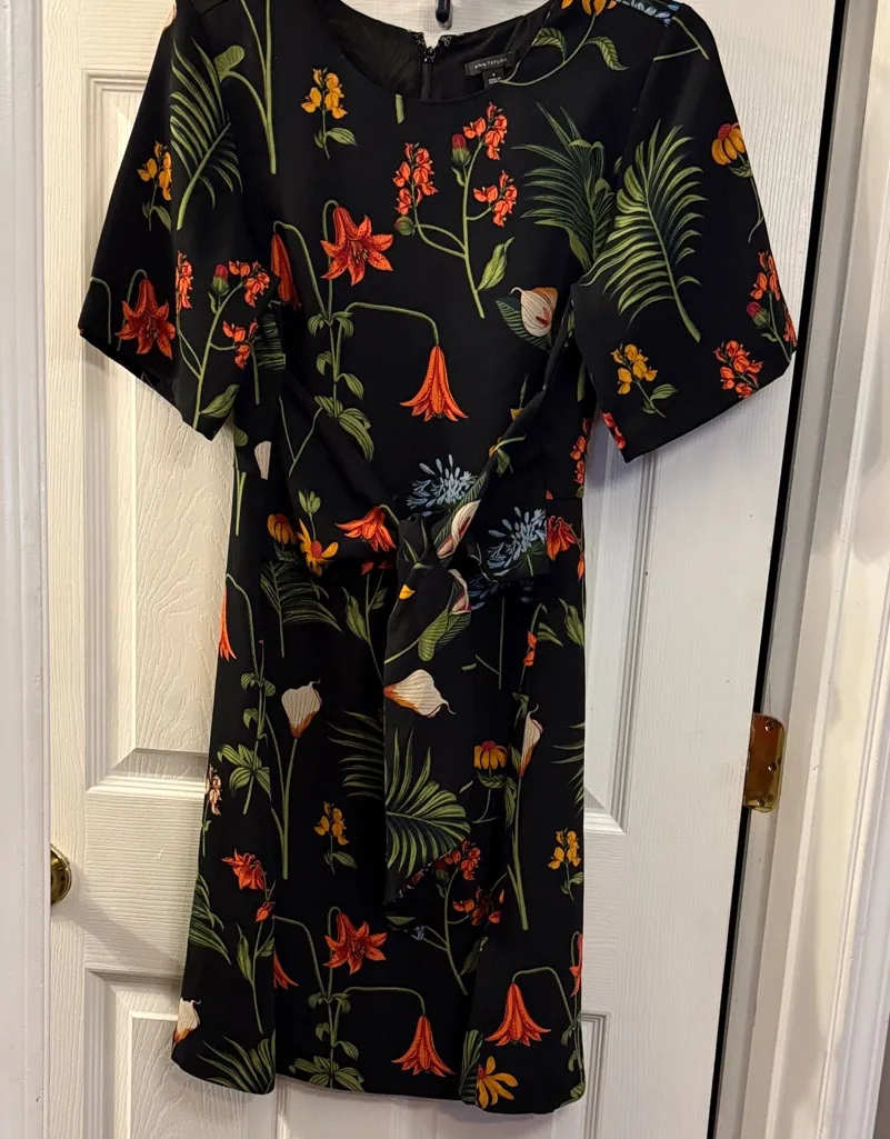 Elegant black dress with vibrant floral print. Features short sleeves and a round neckline. Perfect... Show more