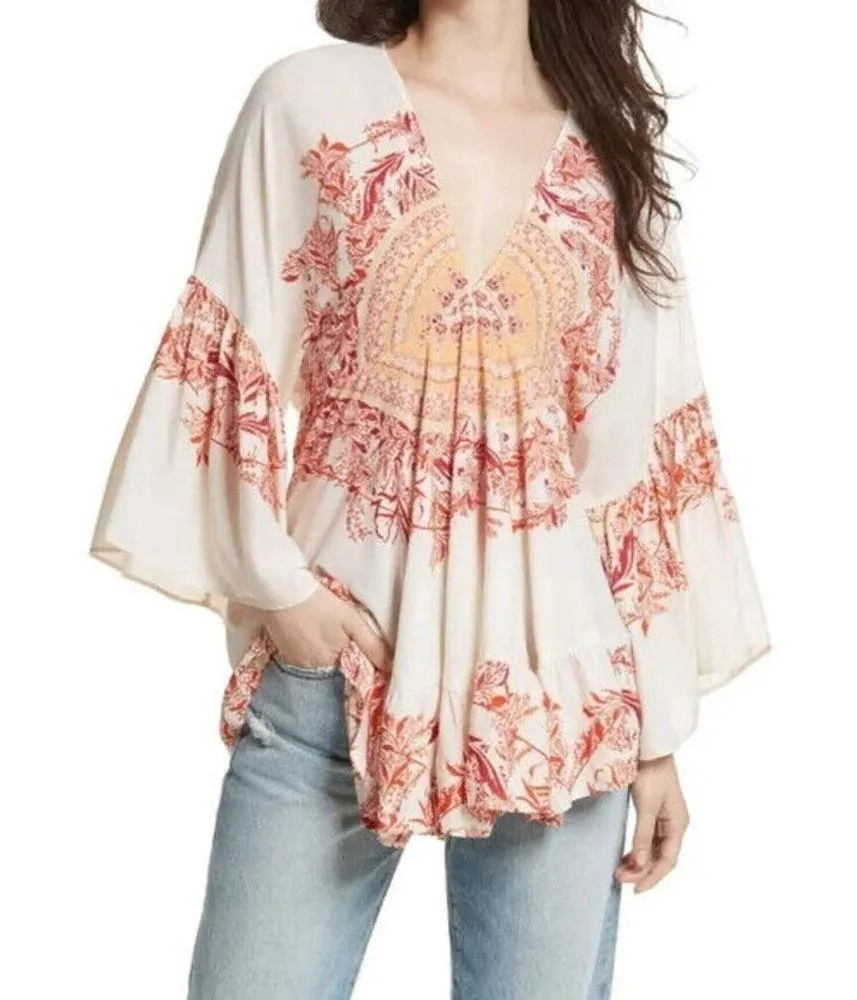 $108 Free People Sunset Dreams Printed Tunic Size XS Ruffle Sleeve Bohemian Relaxed Excellent condi... Show more