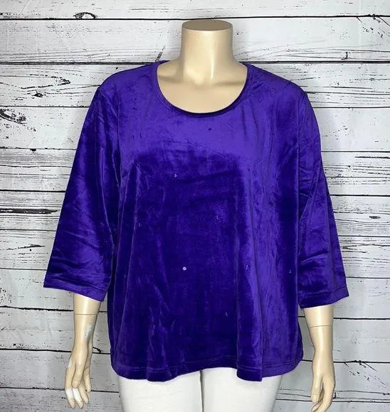Quacker Factory Size 3X Purple - Clear Sequins (Front) Velour Shirt. 3/4 Sleeves. Cotton/Polyester Blend. NWT, Brand New with Tags. Length is 26.5” & Bust is 28.5”. Measurements taken while garment is laying flat.
