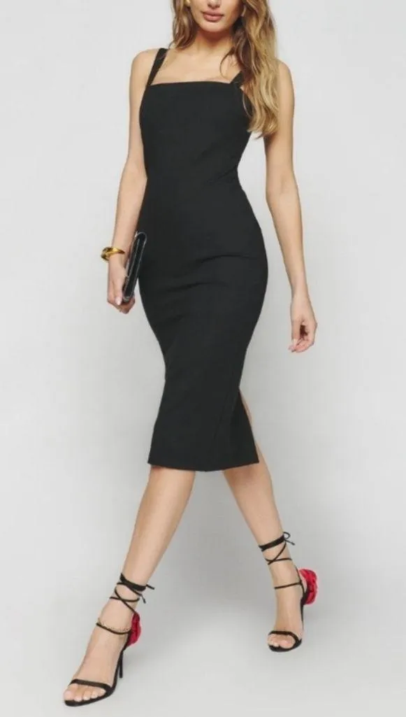 Reformation Women’s Ozzlie Black Square Neck Back Slit Black Sheath Midi Dress Size 0 Good to fair... Show more