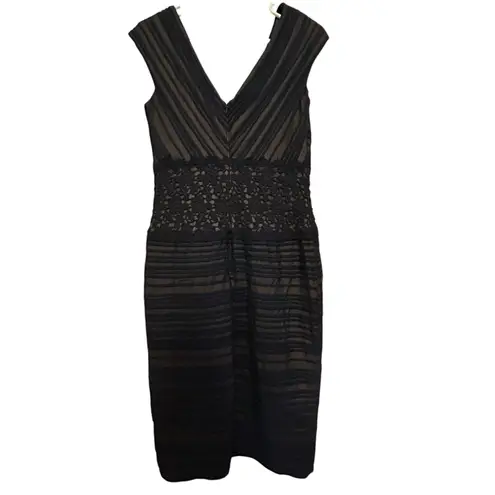Elegant and sophisticated, this Tadashi Shoji navy cocktail dress is perfect for upscale evening events, weddings, and formal parties. Crafted in a rich navy hue, the dress features a flattering surplice V-neckline with soft pleating that enhances the bust, while intricate lace detailing at the waist adds texture and a touch of romance. The striped sheer overlay creates a modern, dimensional look, balanced by a fully lined interior for comfort and coverage. Rubber grip strips along the inside shoulders ensure the dress stays perfectly in place throughout the night. A discreet back zipper allows for easy wear, while the figure-skimming silhouette flatters your curves. The sleeveless design and knee-length hemline make it versatile for year-round cocktail attire, effortlessly pairing with statement jewelry and heels for a show-stopping look.