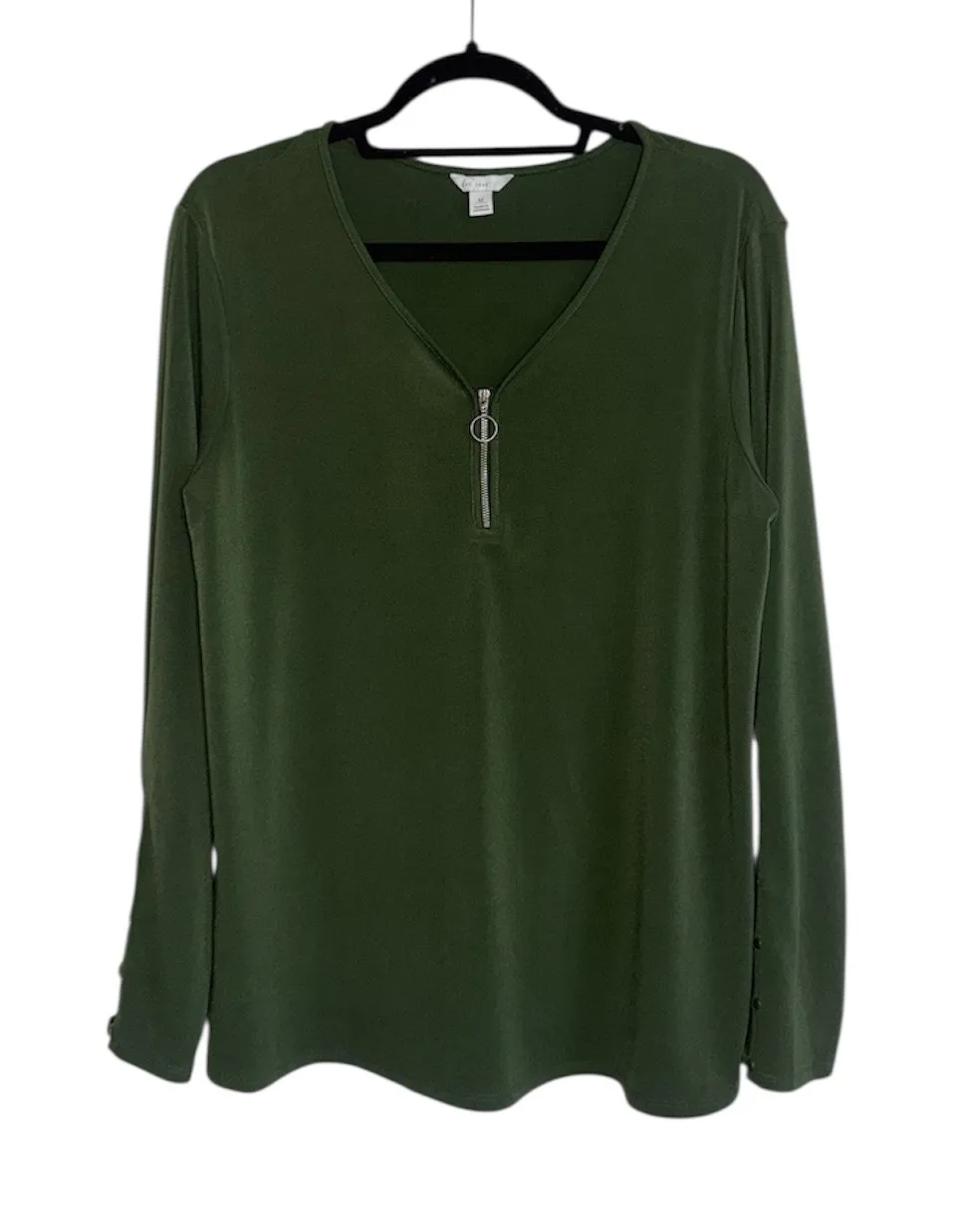 Cato olive green zip front crepe blouse. In excellent condition! V neckline with gold circle zipper... Show more