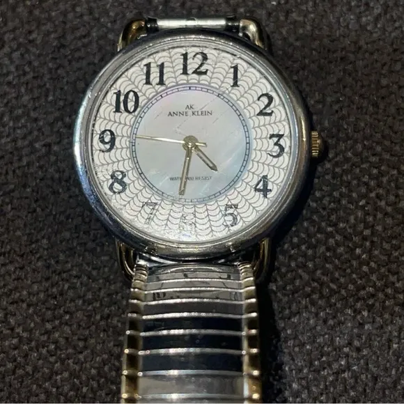 Keywords: Anne Klein, silver, silver tone, gold, gold tone, two tone, spiderweb, indiglo, night glow, mother of pearl, stainless steel, water resistant, casual, streetwear, statement, office, business, professional, party, event, goth, gothic, Halloween, holiday, analog, watch