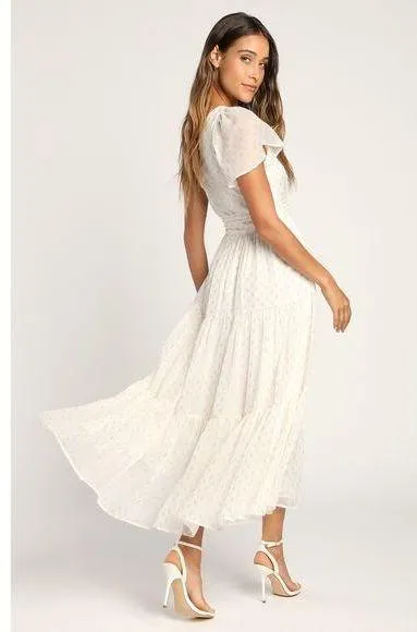 You're sure to spark many a romance in the Lulus Shining Sight White Metallic Gold Dotted One-Shoulder Midi Dress! Lightweight chiffon boasts a pattern of gold lurex-threaded clip dots as it shapes a one-shoulder neckline with a single flutter sleeve, atop a fitted bodice. High waist (with a removable sash belt) tops a tiered skirt that falls to a floaty midi hem.