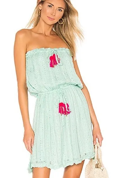 Sea green strapless beach cover up with pink tassels Brand is SUNDRESS Sparkle detail ONE of the t... Show more