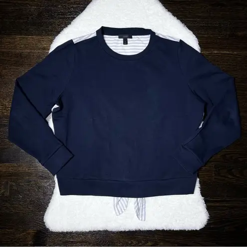 Preowned / used sweater from J Crew. Navy jersey knit on the front and sleeves. Blue and white stri... Show more