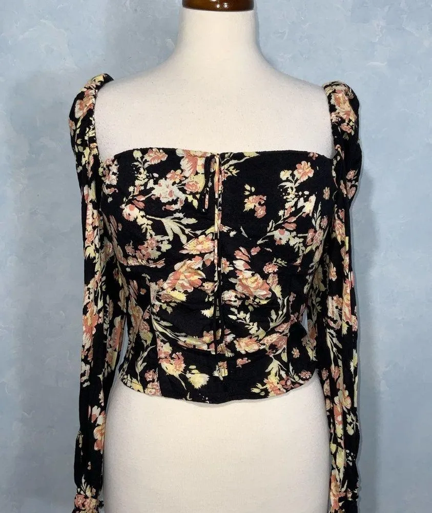 NWOT, Has extra button tags Free People Hillary Square Neck Poof Long Sleeve Floral Tie Keyhole Crop... Show more