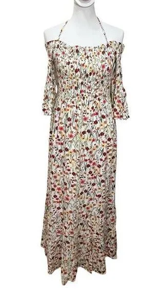 * Off-the-shoulder smocked maxi dress, * Smocked bodice, * Ruffled hem, * Off the shoulder with halter tie, * Elbow length smocked sleeves with ruffle , * Lined body, * Multi color floral print Pre-owned; in excellent condition. No rips, stains or holes. Please see all photos for condition details.