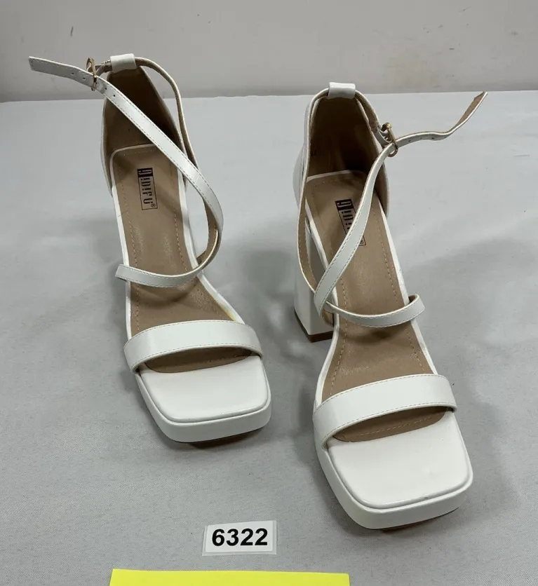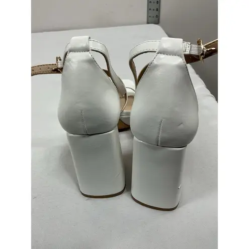 The Inifu Women's Strappy Slip-On Platform Sandals in white feature a stylish open square toe design with an ankle buckle strap closure for a secure fit. The 4.5” high block heel adds a touch of sophistication, making these sandals perfect for a night out or special occasion. Made from faux leather material, these sandals offer both comfort and durability for all-day wear. The slip-on style ensures easy wear, while the 8.5 US shoe size provides a perfect fit for many women looking to elevate their shoe game with these chic sandals. These sandals are NWOT! They do have a mark on the heel.
