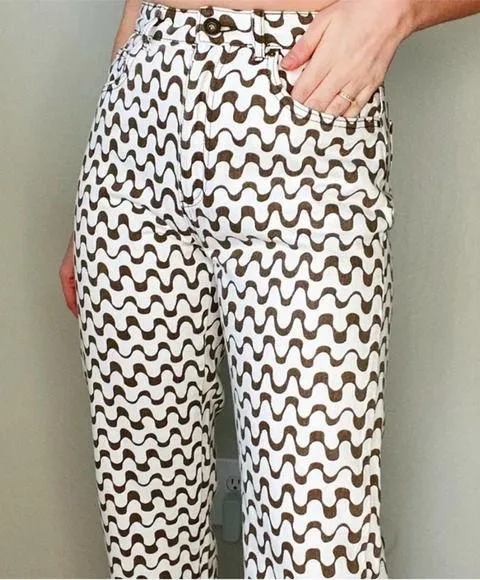 Cotton On High Rise Super Stretch Straight Leg Wavy Geometric Printed Jeans White + brown 70s Groovy... Show more
